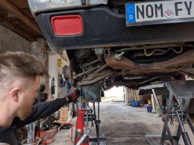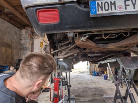 Heute seit mindestens 1 Jahr gebrochene Feder mit Hilfe getauscht,als der Wagen auf der Bühne war mehrere undichte Stellen in puff Anlage entdeckt.Habs gehört das es durch ist ,aber dass die Anlage so durch ist nicht gedacht muss, komplett neu inkl Hosen Rohr alles dünn und rissig mit Schweißen ist da nichts gar kein Material und zu viele kleine Löcher von vorne bis hinten