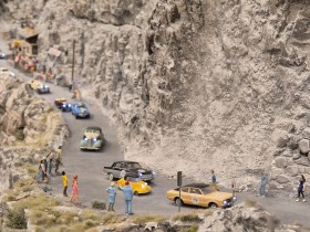 eine Ente als PickUp, ein T1 Bus mit geteilter Frontscheibe, ein VW Typ 4 Variant (ob 411 oder 412 mag ich mich nicht festlegen), ein DKW Junior und ein 2er Transit, lang, ex Krankenwagen mit monströsem Dachträger über die gesamte Länge und rotem "Orientexpress" Schriftzug auf der Seite.