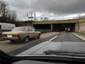 Heute das trockene Wetter ausgenutzt und den Granada wieder in die heimische Garage geholt, dabei von dem hier freundlich hupend überholt worden