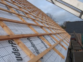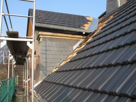 2010 machen lassen, Schalung war schon da, dann Folie, Dämmung, Folie, Lattung, Dachsteine.