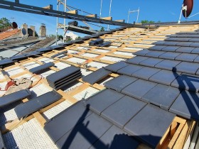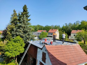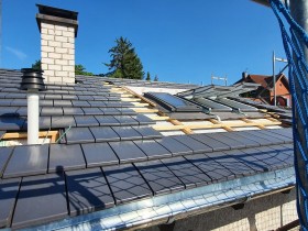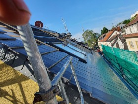 Seit langem geplant, die letzten zwei Tage begonnen: das Dach unseres "Nebengelasses". Endlich regnet's (hoffentlich) nicht mehr rein und irgendwann kann auch mal ein olles Auto in die Garage.