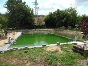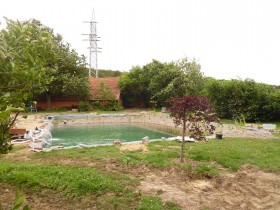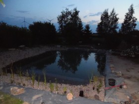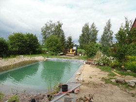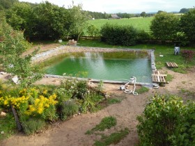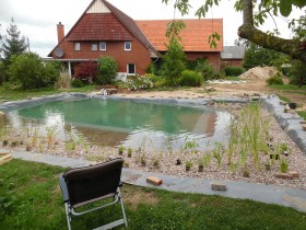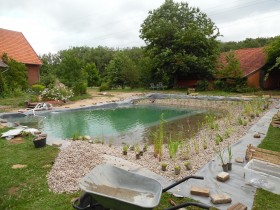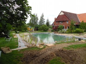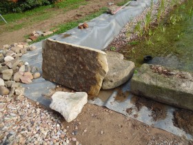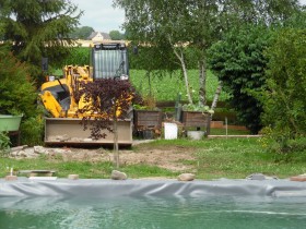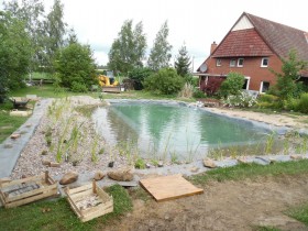 So'n Natur/Schwimmteich ist was feines ... Du beschwerst dich über eure Bodenqualität? Egal, wo ich den Spaten oder den Baggerlöffel reinhaue, treffe ich nen Sandsteinklotz oder halt Platten. Wir sind ne Sandsteinregion. Alles was tiefer als nen Pflug in den Boden geht, sollte genug Leistung haben. Man trifft kontinuierlich auf wenigstens fussballgroße Klumpen. So schon abtreppen, wie ihr das bei euch hinbekommen habt, ist hier bodentechnich gar nicht möglich.