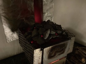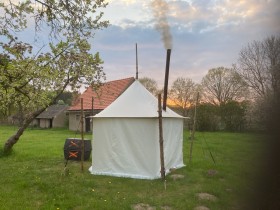 Den Ofen hat sie im Netz bestellt. Der hat ganz gut gewerkelt und das Zeltsaunadingens auf