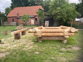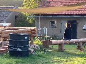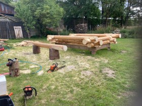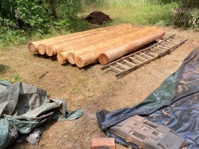 Vor zwei Wintern gabs hier zwei ordentlich gewaltige Stuerme und es fiel einiges an Holz um. Den zustaendigen Foerster kontaktiert und ab mim Bruder in den Wald (auch so'n Foerster- leider nicht zustaendig) und schoene, gerade Fichtenstaemme ausgewaehlt. Kiefer ist zu harzig und Douglasie war nicht zu finden. Deshalb Fichte. Das Zeug abgelaengt, auf'n Haenger geladen und ab zum Putzen.