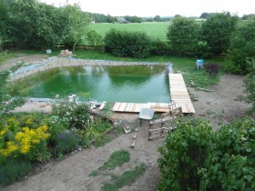 Den haben wir komplett aus Zeugs das noch herumlag gebastelt, erstmal eine Reihe dicke Kantensteine unter die Folie um die Höhe ein bißchen zu optimieren und um eine vernünftige und feste Kante zu haben und um den Überlauf im flachen Bereich, möglichst weit weg vom Haus zu haben, dann Europaletten an einer Seite entfusst und draufgelegt, dann Bretter (die meiner Vermutung nach mein Opa mal durch akkurates Auseinanderbauen von Einwegpaletten angesammelt hatte und die ich, als sein Haus verkauft wurde, da nicht hatte liegen lassen können) draufgespaxt und fertig ist der Steg für die ersten paar Jahre, das wird wohl so lange halten bis wir uns was haltbareres ausgedacht haben und dieses dann auch wieder bezahlen können.