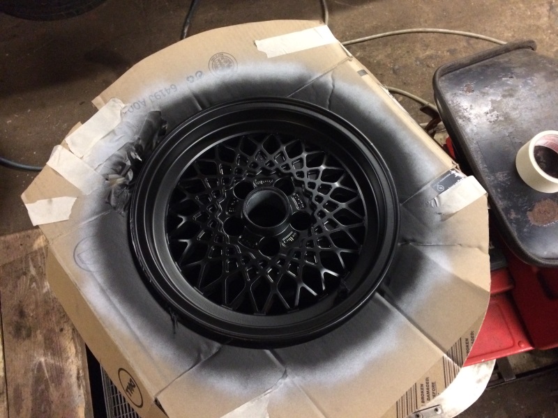 Bei der Gelegenheit gleich den anderen Satz Räder mit 205-60er Bereifung angebaut (vorher 65, beides eingetragen), die in den letzten Tagen grundiert und in ein freundliches Mattschwarz gehüllt wurden.