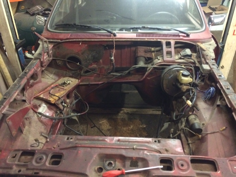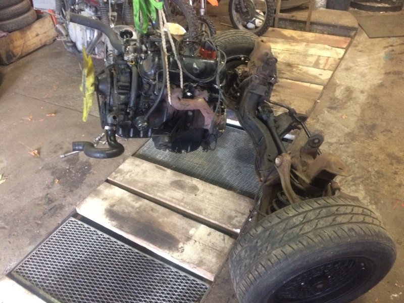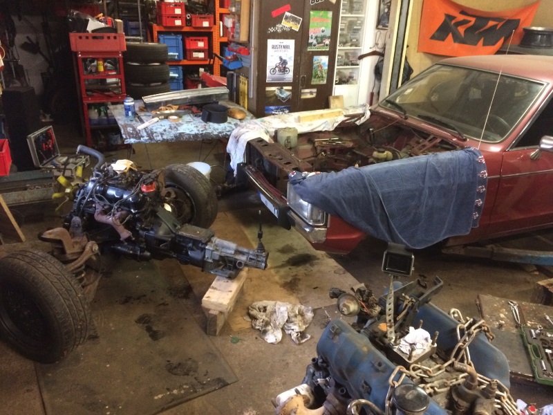 Auspuff und Kardan hatte ich schon über der Grube entfernt, dann auf der Bühne Kühler raus, Lenkung, Brems- und sonstige Leitungen getrennt usw. und Getriebe abgestützt.