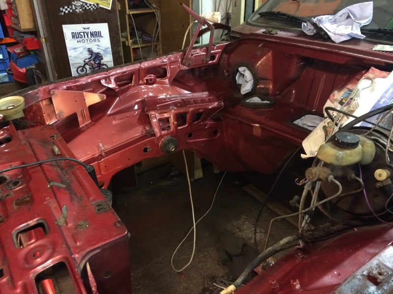 Die ernsthaften Roststellen im Motorraum sind jetzt beseitigt und mit Brantho behandelt. Die restliche Patina muss aber bleiben. Also wie immer: Viel besser als vorher, aber nicht perfekt. Heute abend gibt's die Originalfarbe auf die behandelten Stellen.
