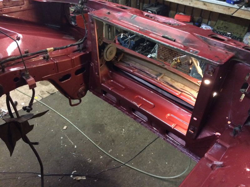 Ganz so hübsch wirds im Motorraum nicht, aber der Korrosion wird Einhalt geboten. Unten rechts hat der Kühler wohl einmal mit Undichtigkeit das Blech bedampft und angegriffen. Die Ecke musste ich ersetzen.