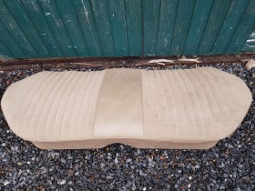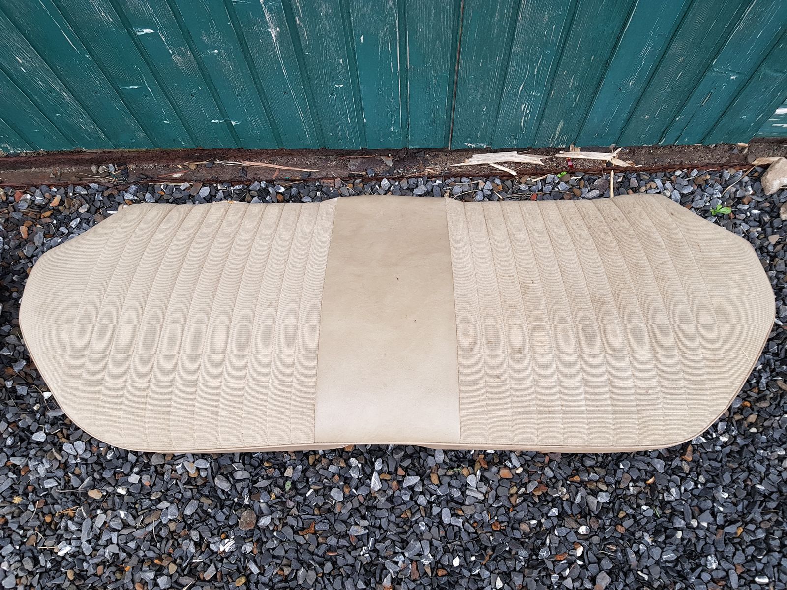 Beiges Rückbankunterteil (Stoff), staubig vom Lagern der letzten Jahre.