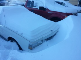 Wenigsten ist dem Wagen dank Blockheater und Erhaltungsladegerät völlig egal, dass er da seit gut 2 Wochen in der Kälte einschneite.