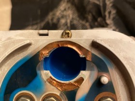 Von der untere Kupferbahn fehlt ein Stück. Wenn ich dort die Lampe eindrehe hat der Pluspol keinen Kontakt mehr. Den Dimmersschalter habe ich überprüft, indem ich die Lampen direkt angeschlossen habe.