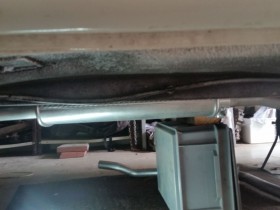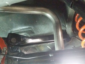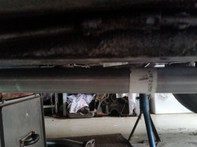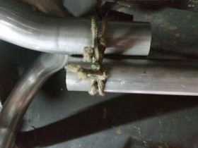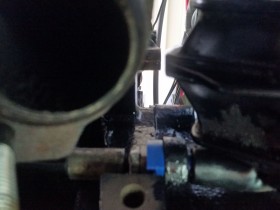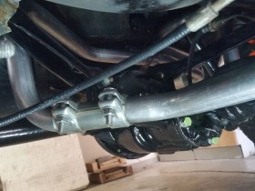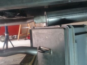 Vorletztes Bild zeigt den Abstand linker Topf - Hosenrohr und das letzte, wie schräg das Hosenrohr nach unten kommt. Höher krieg ich das nicht - mehr Drehung in der Krümmeraufnahme is nich - , da muss nachgearbeitet werden. Kürzen - Biegen - Schweißen, oder hat jemand ne bessere Idee?