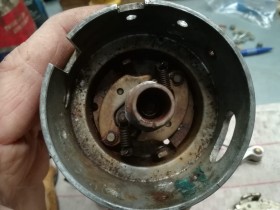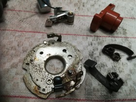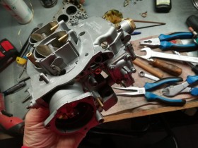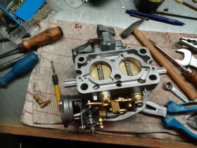 Der Vergaser ist offenbar ein "Hybrid" aus zwei verschiedenen Serien, siehe auch Bildmaterial. Er wurde abgebaut, zerlegt, per Ultraschallbad und Perlstrahlung behandelt. Düsen auf den Motor abgestimmt und per Solex-Kennblatt eingestellt. Drosselklappenlager ausgebuchst, Wellen erneuert, Vergaseroberteil auf den Originalstand gebracht. Vergaser jetzt praktisch wieder neuwertig. Somit Fehler ausgeschaltet, der mittelfristig zu einem Motorschaden geführt hätte, den Motor erhielt mit bisherigem Setup nach meinem Verständnis unkontrolliert Benzin. Vorhandener V6-Motor ist ein US-Modell, mit etwas anderen Abgasanschlüssen, die totzulegen waren. Möglicherweise Ansaugspinne undicht, und/oder Ventile zu stramm. Prüfung diesbezüglich läuft. Vorhandener Luftfilter jedenfalls völlig ungeeiget für diesen Motor. Ersatz durch (durch mich bei BMS Racing bestelltem) neuen Sportluftfilter. Zudem Zündverteiler zerlegt. Überholung erforderlich, da Verteilerwelle so ausgeschlagen war, dass immer wieder Zündaussetzer erfolgten. Siehe ebenfalls anliegende Fotos.