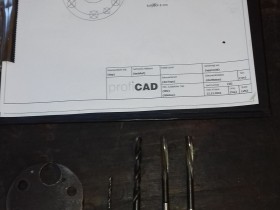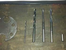 Die Werkzeuge: eine etwas Krude, aber doch präzise Bohrschablone nach Zeichnung, ein 4mm Bohrer, ein 7,9mm Bohrer, eine Reibahle 7,985mm, eine Reibahle 8,01mm, zwei Stahlstifte 8,01mm, 24mm lang.