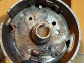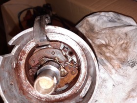 edith, und wie ich grad beim weiter zerlegen sehe, wohl auch eine fliehkraftverstellung. die gegenseite der zweiten fehlenden feder scheint zur hälfte abgebrochen.