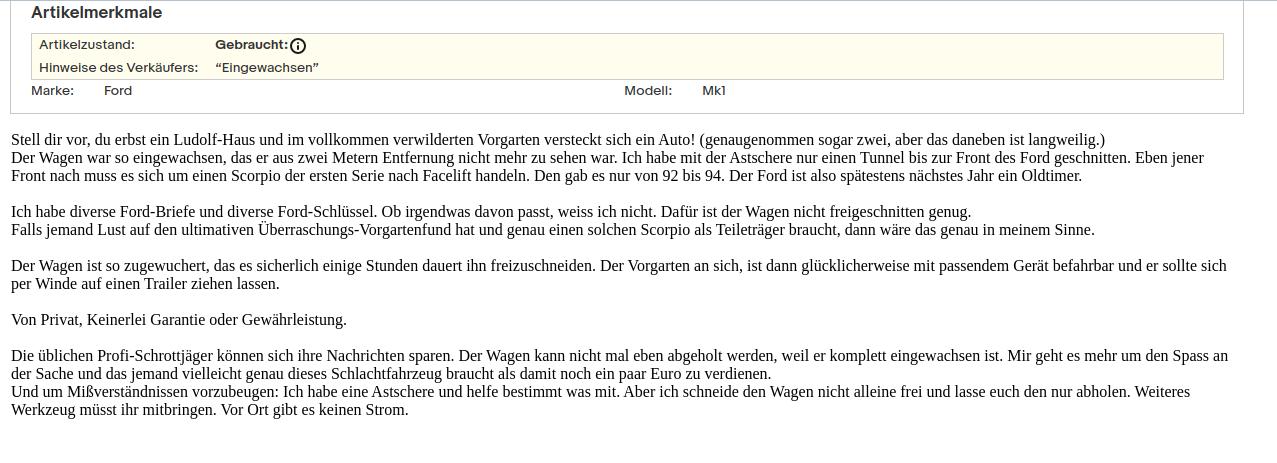 Echt jetzt? Hat der Scorpio-Besitzer Dich nicht bei der Abholung bemerkt? Oder hat sich sein Rottweiler in den Brombeerrranken verstrickt, als er den hinter Dir hergejagt hat?