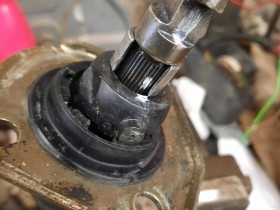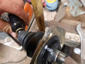 Dazu diese verpresste Scheibe über dem Gummi zerbröseln (Flex, Säge, Feile...), damit man das Gummi in Richtung der Antivibrationsbuchse hochschieben kann.