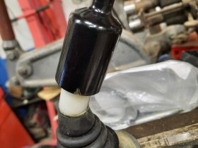 • Die Kunstoffbuchse ist ja auch geschlitzt, eigentlich kriegt man die so drüber gewürgt, ohne das sie aufplatzt. Aber man muss die zurecht sägen und feilen, je nach Schalthebel muss die evtl auch etwas schräg werden.