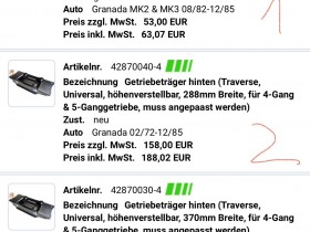 Am besten geht es mit einer originalen Granada 5-Gang Traverse, dann ca. 15 - 20 mm Distanzstücke zwischen Traverse und Karosserie ( je nach Kardanwinkel) und eventuell die Löcher in der Traverse leicht versetzt neu bohren oder auffeilen. Die Löcher müssen ja eh modifiziert werden, 5 - Gang Traversen haben nur Löcher für M8 Schrauben.