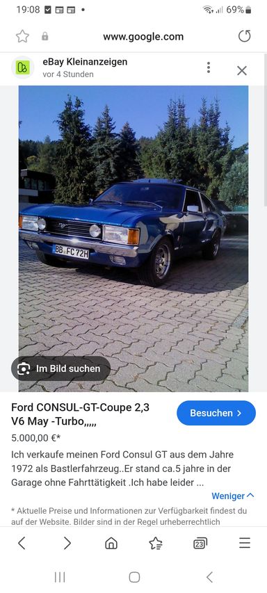 Consul Fastback in blau. Recaros oder ähnliche Sitze. Sah auf den Bildern nicht allzu arg aus.