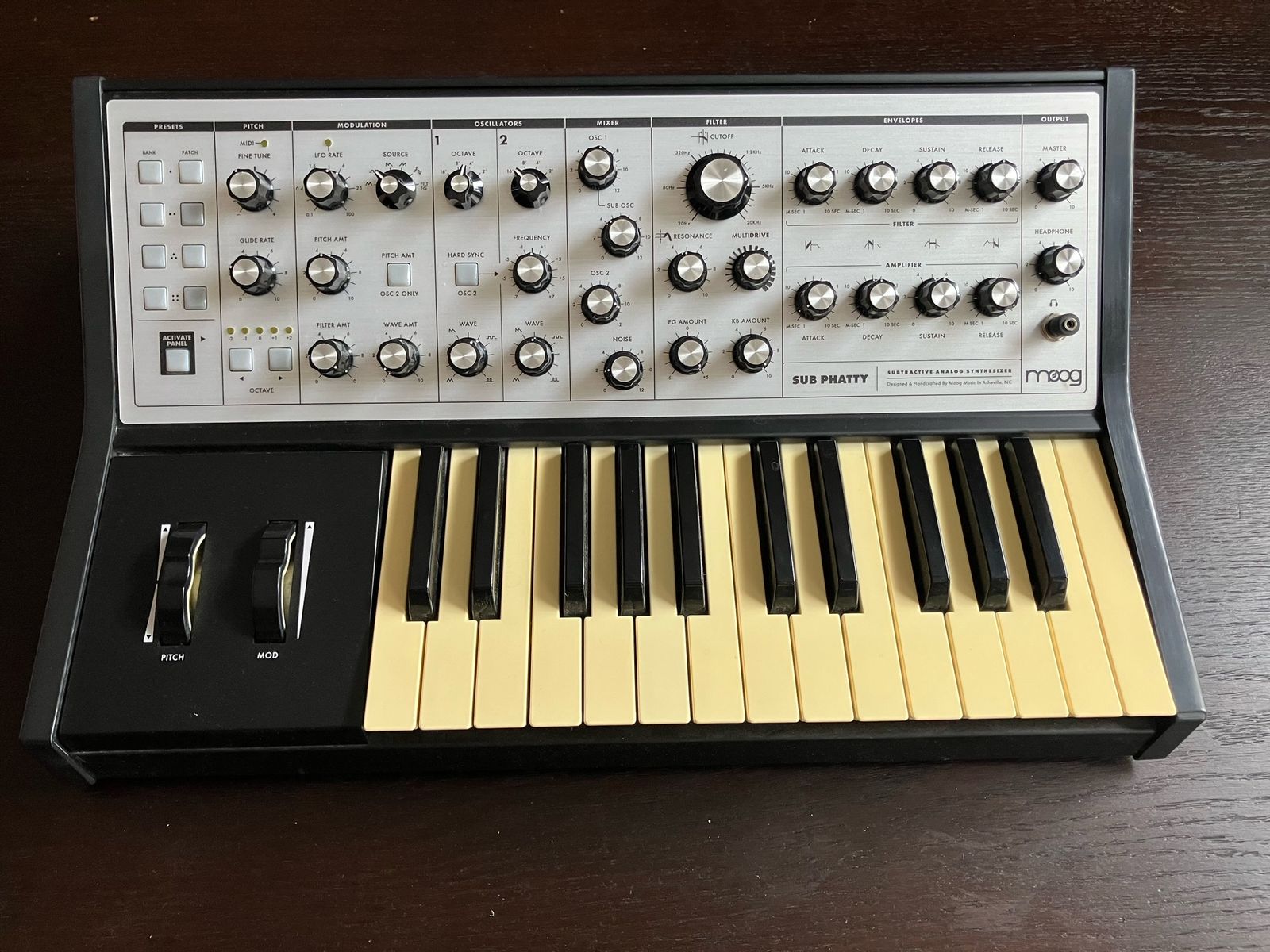 Es handelt sich um einen Moog Sub Phatty, einen monophonen Analog-Synthseizer mit digitaler Steuerung und MIDI.
