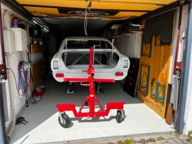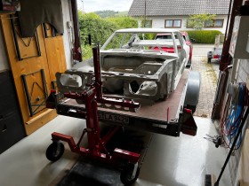 Hinten dann Wagen drunter und vom Hänger bis zum Ende vom Hänger geschoben, dann auf Böcken aufgesetzt und den Anhänger weggefahren. Also so geklappt wie ich mir das vorgestellt habe. Nur der hintere Querträger ist halt kleiner als der Abstand der Stoßstangenaufnahme am Taunus